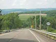 New York State Route 215 (NY 215) is a north–south state highway located entirely within Cortland County, New York, in the United States. It extends for just over 6 miles (10 km) from an intersection with NY 392 in the town of Virgil to a junction with NY 13 in the city of Cortland. NY 215 is largely a rural connector highway, except for the final 0.5-mile (0.8 km) in the city of Cortland. The entirety of NY 215 was originally part of NY 90. In the early 1980s, NY 90 was truncated north to its junction with U.S. Route 11 (US 11) and NY 41 in the village of Homer. Its former routing south of the city was redesignated as NY 215 and NY 392.