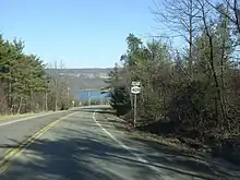 NY 409 begins at a grade crossing with the Norfolk Southern Railway in the town of Dix,[3] where maintenance of Station Road shifts from Dix to the New York State Department of Transportation.[4] The route initially heads to the northeast through an isolated rural area, running along the northern fringe of Watkins Glen State Park to the western edge of a valley overlooking Seneca Lake and the village of Watkins Glen. Here, NY 409 turns northward, slowly descending into the gorge as it crosses into the town of Reading. After 0.5 miles (0.8 km), the route curves back to the east and rapidly descends in elevation on its way into the village of Watkins Glen.[3]