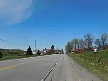 NY 98, meanwhile, proceeds toward the county line on Quaker Hill Road, which forms the first portion of the linear north–south alignment that the remainder of NY 98 takes to its northern terminus near Lake Ontario. About 0.5 miles (0.8 km) south of Orleans County, NY 98 passes through a marshy area and crosses over Oak Orchard Creek, here contained within a canal that takes the stream through the nearby swamps. The marshes follow NY 98 into Orleans County and the town of Barre, where the route meets County Route 99 (CR 99) at a junction 3 miles (5 km) north of the county line. Until the early 1950s, CR 99 (West Barre Road) was part of NY 279, which overlapped NY 98 between this point and its current southern terminus in the town of Gaines.[4][5] Past CR 99, Oak Orchard Road returns from its eastern sojourn and carries NY 98 as it heads across firmer areas through Barre Center and crosses into the town of Albion.