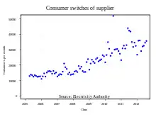 Retailers purchase electricity from the wholesale market, and on-sell it to consumers. Competition for retail customers varies across the country but since 1999, when full retail competition was introduced, customers have switched at a rate between 9% and 14% per annum.[5] Consumer NZ, with support from the Ministry of Consumer Affairs, provides a website called Powerswitch that enables consumers to compare electricity and gas prices from different retailers and to switch suppliers.[6]
