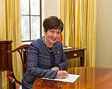 The monarch of New Zealand – currently King Charles III, represented in New Zealand by the Governor-General, Dame Cindy Kiro – is one of the components of Parliament. This results from the role of the monarch to sign into law (give Royal Assent to) the bills that have been passed by the House of Representatives.[2] MPs must express their loyalty to the King and defer to his authority, as the Oath of Allegiance must be recited by all new parliamentarians before they may take their seat,[36] and the official opposition is traditionally dubbed His Majesty's Loyal Opposition.[37]