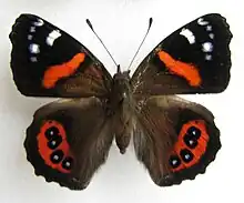 The red admiral is a medium-sized butterfly with a 50–60 mm wingspan.[1][2] The top side of the forewings is mostly black, with a central bright red bar running back from the front edge. There are white spots, fringed with light blue, near the forewing tips. The rear wings are a dark reddish brown with a red patch containing four black circles; the centre of each circle is pale blue.