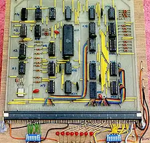 A bare-bones Newbear 77-68 The blue and white block of DIP switches to the bottom left addressed a word of memory; the LEDs in the bottom centre displayed the contents of that word and the switches to the bottom right could be set to enter a program or data, one word at a time.