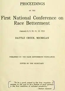 - ↑ "Proceedings of the First National Conference on Race Betterment: January 8, 9, 10, 11, 12, 1914, Battle Creek, Michigan". Archived from the original on 2016-04-26. Retrieved 2016-04-19.