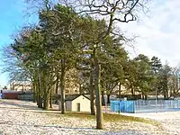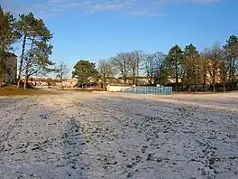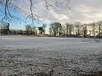 By 1957 the pavilions and curling storage buildings had disappeared and the loch is marked as disused.[3] In 1957/8 a local from New Farm recorded that the fields around the loch were littered with curling stones and the loch itself, although drained, was still very visible; an oblong shape totally surrounded by trees with the drainage apparatus at the end and a sawmill on the edge nearest to New Farm. The Dick Institute in Kilmarnock holds oil paintings and photographs of curlers on New Farm Loch. One, by local artist Alexander MacKay, shows a late afternoon view, there are crowds out on the ice, with a wide range of townsfolk. Several games of curling underway but some are entertaining themselves by pushing others over. This partly artificial loch provided ice for curling and skating for over 100 years.[4] In the early days of the new scheme the loch was used as a site for grand fetes.[5]