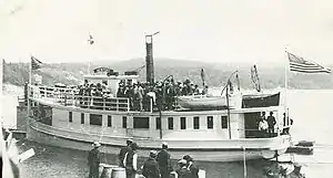 On Sunday, July 24, 1910, Newport transported in one trip, 500 persons to the dock at the Newport waterfront.[16] A crowd of 1,500 people gathered at the dock to greet the new arrivals.[16] A city marshall, M.B. Grant, had to clear a path through the crowd to allow the disembarking passengers to cross the dock from the steamer to the street.[16] While doing so, Grant encountered Howard Bush, a merchant from Summit, Oregon, and asked Bush to step back.[16] Bush refused, struck Grant a blow on his nose with a fist, and knocked Grant to the ground.[16]