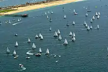 Historically the starting point was close to the Newport Harbor entrance in Corona Del Mar, but thanks in part to the heavy boat traffic at the harbor mouth the starting line was re-positioned some years ago to just offshore of the Balboa Pier on the Balboa Peninsula.