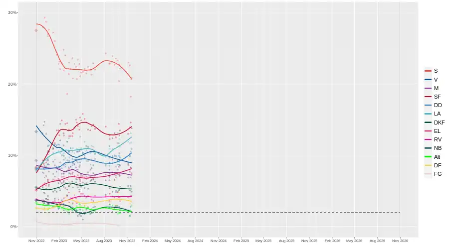 General elections are scheduled to be held in Denmark no later than 31 October 2026, according to § 32 in the constitution, which defines an election cycle as four years. All 179 seats in the Folketing will be up for election, 175 in Denmark proper, two in Greenland and two in the Faroe Islands (the two other territories of the Danish Realm).[2]