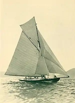 The following year in 1896,[12] she again competed in the English races and won twenty of forty races she participated in,[2][13] and second at others.[14][15] After the 1896 season, Gould returned to America in November 1896 again aboard the SS St. Louis. Although the Niagara did well, Gould swore he would never race in the British regattas again (due to issues with the Yacht Racing Association),[16][17][18] instead favoring the Kiel and Baltic regattas instead.[19]