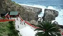 - Udo Shrine (鵜戸神宮, Udo jingū): A shrine built in a cave on a cliff on the coast. According to myth, the main deity of the shrine is the father of the first emperor of Japan, Emperor Jinmu. Visitors pray at the shrine for success in matchmaking and safe childbirth. Below the cliff there is a huge rock shaped like a turtle. It is said that one's wishes will be granted if one can throw a stone into the depression in the center.