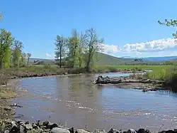 The Nicola River /ˈnɪkoʊlə/, originally French Rivière de Nicholas or Rivière de Nicolas, adapted to Nicolas River, Nicola's River in English, is one of the major tributaries of the Thompson River in the Canadian province of British Columbia, entering the latter at the town of Spences Bridge. It is named for Nicola (Hwistesmexteqen) the most famous chief of the joint community of Nlaka'pamux and Okanagan bands, founded by his father and today known as the Nicolas, (originally Nicola's people), as well as its basin, which is known as the Nicola Country.[1] It drains most of the northern Thompson Plateau, beginning near the very eastern edge of the plateau only 30 kilometres (19 mi) northwest of Kelowna, and flows from there more or less westward to feed Douglas Lake and Nicola Lake, with about 15 kilometres (9 mi) of the river's length between those two lakes. Nicola Lake at 20 kilometres (12 mi) long is the largest in the basin; the Nicola River enters at 3/4 way of its length up from its outlet, 10 kilometres (6 mi) downstream from which is Nicola Valley centre and Coquihalla Highway city of Merritt. From there the river flows 60 kilometres (37 mi) northwest to the Thompson, and is followed on that route by British Columbia Highway 8 and a spur line of the Canadian Pacific Railway.