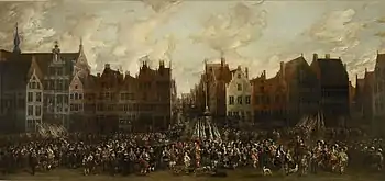 Van Eyck also painted civil processions, including a composition representing the Grand parade of the civil guard of Antwerp on the Meir (1672, Vleeshuis, Antwerp).[10] A Scene from a parade of the civil guard (Hospitalfield Arts) appears to be a fragment of a painting depicting a parade of the civil guard in Antwerp. The scene shows a demonstration of fire arms. A row of arquebusiers are discharging their rifles in the direction of a row of men standing in front of them. Clearly they were not using real bullets but only powder.[11][12] Such displays appear to have been common in civil parades of that time as can be seen in the Ommeganck in Brussels on 31 May 1615 by Denis van Alsloot, which includes a similar scene.[12]