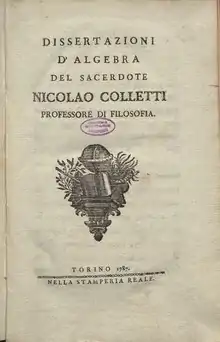 In 1787 his book about mathematics Dissertazioni d'algebra was published in Turin.[2][3]
