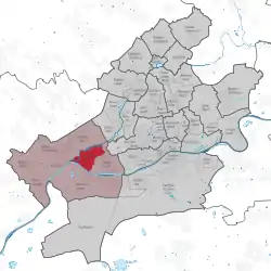 Location of Nied (red) and the Ortsbezirk West (light red) within Frankfurt am Main