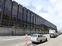 In 1961, an architectural competition was announced for a new building for Nationalbank, which was won by Arne Jacobsen. As the bank had to be in operation throughout the construction period, the construction had to be done in stages. It started in the north in 1964, where, among other things, the Hotel Kongen af Danmark was demolished. The rest of the southern side of Niels Juels Gade was also gradually cleared, including the Schultz Forlag sbuilding in no. 10-12, which they had built in 1872. The combined Nationalbank was completed in 1978. Along Niels Juels Gade is the five-storey main building with a plinth wall in Norwegian marble on the ground floor and dark-tinted glass on the other floors, like the houses on the other side of the street is reflected in. Inside the main building, there are two light gardens with roof gardens on top of the ground floor, so that daylight can enter the building. On the other hand, there are no doors on this side of the building, as the main entrance is on Havnegade. On the other hand, there are a number of trees along the bank on Niels Juels Gade.[6][7]