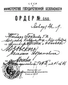The sentence stated that the defendants would receive "the severest measure of punishment for the crimes committed by them jointly: execution, with all of their property to be confiscated."[27] The court also stripped the men of their medals and made petitions to remove military commendations such as the Order of Lenin and the Order of the Red Banner of Labour. On 12 August 1952, thirteen of the defendants (excluding Lina Stern and Solomon Bregman) were executed in the basement of Lubyanka Prison.[28] After the execution of the defendants, the trial and its results were kept secret. There was not a single reference to the trial or the execution in Soviet newspapers. Defendants' families were charged with "being relatives of traitors to the motherland" and exiled in December 1952. They did not learn about the fates of their family members until November 1955, when the case was reopened.[26]