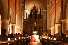 In addition to lighting candles at the altar, common elements inside the church include the Eucharistic exposed for adoration, contemporary Christian music, submitting prayer intentions, and priests on hand to administer the Sacrament of Reconciliation or to provide prayer, support, and counsel.[1][6][7] Nightfever typically goes late into the night.[3]