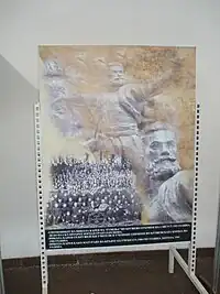 A panel from the Ilinden memorial in Kruševo, showing the monument of Nikola Karev at "Gumenya" in Kruševo, uncovered on August 2, 1953, and two photographs: Nikola Karev with Kruševo teachers and students photographed in 1900 in the Kruševo grove and Nikola Karev with the 1900–1901 graduates from the Bulgarian Gymnasium in Bitola.