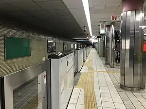 • The station has side platforms serving two tracks for the Sakaisuji Line on the first basement, and an island platform serving two tracks for the Sennichimae Line on the second basement. Ticket gates are located on the first basement on the platforms for the Sakaisuji Line.