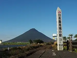 ![]() Marker of Nishi-Ōyama Station being the southernmost station of JR Group, with Kaimon-dake in the background, December 2017 | |||||||||||