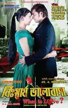 Nishwartha Bhalobasa (Bengali: নিঃস্বার্থ ভালোবাসা, lit. 'Selfless Love', English title What is Love?) is a Bangladeshi romantic-action-comedy film directed by Ananta Jalil, starring Ananta and Barsha in the lead roles.[1][2] The film was produced by Ananta Jalil under the banner of Monsoon Films. Action hero Ananta made his debut as a director in this film.[3] Nishwartha Bhalobasa was premiered at 66th annual Cannes Film Festival.[4][5] The film was released on Eid al-Fitr, 2013 in Bangladesh.[6][7][8][9]