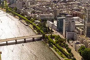 Nizza is located on the north bank of the Main and stretches from the Friedensbrücke bridge to the Untermainbrücke bridge, across the Bahnhofsviertel (Railway Station Quarter), Innenstadt (Inner City), and Altstadt (Old Town) districts. An avenue of plane trees runs along the length of the Nizza river bank, alongside the Frankfurt City Link Line railway. The western part of Nizza includes the preserved Herkules crane, formerly part of the Frankfurt harbour, and is crossed by the Holbeinsteg bridge.[2] The central part of Nizza includes the Main-Nizza restaurant and a landscaped Mediterranean garden. The eastern end of Nizza, on the other side of the Untermainbrücke, includes a water playground for children.[3]