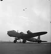 In July 1943 the squadron commenced mine laying duties using the Stirling and from February 1944 performed supply drops for the Special Operations Executive. In May 1944 the squadron was moved to No. 100 (Radio Countermeasures) Group with tasking to perform radar jamming operations during the D-Day landings. The squadron aircraft also joined the heavy bomber raids over Germany but was equipped with advanced radar jamming equipment to disrupt the German air defences. In 1945 the Stirlings were exchanged for the Handley Page Halifax until the squadron was disbanded on 29 July 1945 at RAF North Creake.[2]