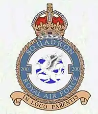 No. 200 Squadron of the Royal Air Force operated during the First and Second World War. The squadron was first formed in mid-1917 and during the First World War, it undertook a training role, before being disbanded in mid-1919. It was re-formed in 1941, and operated maritime patrol aircraft firstly from the United Kingdom, and then west Africa until early 1944 when it moved to India. In April 1945, the squadron was disbanded, having been renumbered No. 8 Squadron RAF.