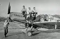![]() Members of No. 322 Squadron with a Spitfire. Part of the 3W squadron code can be seen, as well as the Royal Netherlands Air Force insignia by the cockpit. | |