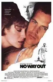 No Way Out is a 1987 American neo-noir[1] action thriller film directed by Roger Donaldson and starring Kevin Costner, Gene Hackman, Will Patton, and Sean Young. Howard Duff, George Dzundza, Jason Bernard, Fred Thompson, and Iman appear in supporting roles. The film is based on the 1946 novel The Big Clock by Kenneth Fearing, previously filmed as The Big Clock (1948) and Police Python 357 (1976).