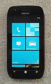 Nokia Lumia 710 is a Windows Phone 7 smartphone.[5] Its release is part of a change in company's direction which has resulted in a shift from Symbian platform towards Windows Phone for smartphones. While the Nokia Lumia 800 and Lumia 900 target the high-end of the smartphone marketplace, the Lumia 610 and Lumia 710 are aimed at the mid-range price point.[6] This generation of Lumia phones ship with Windows Phone 7.5 "Mango". Its design is almost the same as the Symbian Nokia 603, announced just over a week earlier.[7][8]
