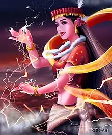 In Meitei mythology and religion, Nongthang Leima (Meitei: ꯅꯣꯡꯊꯥꯡ ꯂꯩꯃ) is the goddess of seduction, thunder, and lightning.[2][3][4][5] She was created by Atingkok (or Salailen) to attract Haraba (Pakhangba).[4][6][7] She mastered thunder and lightning in the chaos in the early world. She predicted the first rain.[8] She limits the chaos and helps creation.[9]
