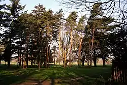The site of the banqueting house is clearly visible in the far west of the park near the A240 road; the Tudor structure was demolished in 1667 but a retaining wall, approximately 1m high, was rebuilt in the nineteenth century incorporating some original Tudor bricks as part of a conversion to an arboretum.[14]