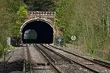 Norbury Park was purchased by Thomas Grissell in 1850. It was during his ownership that the railway line from Leatherhead to Dorking was built. Grissell insisted that the three viaducts over the River Mole be built with coloured brickwork with decorative cornices and cast-iron parapets. Similarly, the 480 m-long (520 yd) Mickleham Tunnel was bored through the chalk with no vertical ventilation shafts.[10] When the line opened in 1867, Grissell secured the right to stop on request any train passing through the railway station at Westhumble, a concession that was abolished by the Transport Act 1962. The station was designed by Charles Henry Driver in the Châteauesque style and included steeply pitched roofs with patterned tiles and an ornamental turret topped with a decorative grille and weather vane.[11]