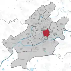 Location of the Nordend (red) and the Ortsbezirk Innenstadt III (light red) within Frankfurt am Main