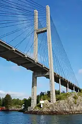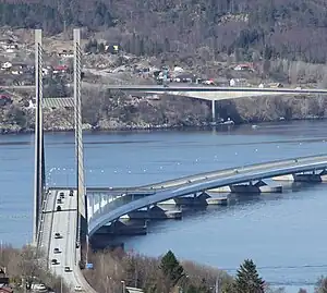 The Nordhordland Bridge (Norwegian: Nordhordlandsbrua) is a combined cable-stayed and pontoon bridge which crosses Salhusfjorden between Klauvaneset (in Bergen Municipality) and the island of Flatøy (in Alver Municipality) in Vestland county, Norway. It is 1,614 meters (5,295 ft) long, of which the pontoon section is 1,246 meters (4,088 ft) long. The cable-stayed section consists of a single 99-meter (325 ft) tall H-pylon which has a length of 368 meters (1,207 ft) and a main span of 172 meters (564 ft). This allows for a clearance of 32 meters (105 ft).