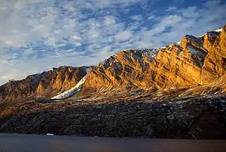 ![]() Mountainside glacier tongue above the Nordvestfjord shore. |