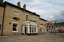 It takes its name from the Dukes of Norfolk, a major landowning family in the area who constructed many of the buildings in the square, which was once known as Norfolk Gardens.[1] Glossop Market and Glossop Town Hall are on the southern side, dating from 1838.[2] Many of the square's buildings are listed as Grade II amongst the numerous listed buildings in the town. The Norfolk Arms public house, dating from 1823, stands by the crossroads.[3] The northern side of the square features the 1914 Partington Theatre.[4] The middle of the square is a pedestrianised garden featuring an 1881 drinking fountain and a war memorial commemorating the dead of the First World War.[5][6] In the early twentieth century it was connected to the Glossop Tramway before its closure in 1927.