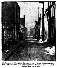 On Wednesday night, 22 June 1927, Norman Bruhn and three other men engaged a taxi-driver near Paddington Post-office. At their request the driver, Noel Infield, took them to Charlotte-lane in Darlinghurst, close to the south-east corner of Hyde Park, and was told to wait.[59] At about ten o'clock the four men entered Mack's, a house at 22 Hargrave-street (on the corner with Charlotte-lane) owned by Joe McNamara and his brother which they operated as a sly-grog shop.[60][61][52] Bruhn's companions were Robert Miller, a man named Hassett and another man. McNamara later gave evidence that he knew the third man as 'Snowy' (possibly 'Snowy' Cutmore).[62] After remaining on the premises for about fifteen minutes, Bruhn's group left Mack's.[60] On leaving the house Bruhn and his companions were approached by two men in Charlotte-lane. As they pushed past Miller, one of them said to him, "You get out of this, you’re not in it".[53] One of the men then drew a revolver and shot Bruhn multiple times at close range. Five shots were fired, of which three hit their target. Bruhn slumped to the laneway, two .32 calibre bullet wounds in his abdomen and another which grazed his chest in two places.[63] Constable Blench, who was walking along nearby Yurong-street, heard the five shots at about 10.30 p.m., fired in quick succession. He ran into Charlotte-lane and saw Bruhn lying in a pool of blood, with Miller bending over him. Blench also saw two men running from the scene.[64][65] Bruhn was put into Infield's taxi and taken to Sydney Hospital.[66] At the hospital Constable Blench later reported that Miller remarked to him, regarding Bruhn's shooting, "It’s the coldest thing I’ve seen".[62] When Bruhn was admitted to hospital, he was suffering severely from shock as a result of his wounds.[63]