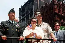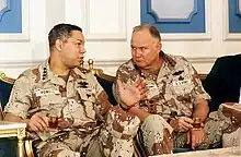He was known to be extremely critical of staff officers who were unprepared, but was even more contentious with other generals who he felt were not aggressive enough. His frequent short temper with subordinates was well known in his command.[137] His leadership style was sometimes criticized by subordinates who felt it reduced their ability to solve problems creatively.[138] Army Chief of Staff Carl E. Vuono, a lifelong friend of Schwarzkopf, described him as "competent, compassionate, egotistical, loyal, opinionated, funny, emotional, sensitive to any slight. At times he can be an overbearing bastard, but not with me."[139] While Colin Powell would say Schwarzkopf's strengths outweighed his weaknesses, Dick Cheney personally disliked what he considered Schwarzkopf's pretentious behavior with subordinates. Cheney doubted Schwarzkopf's ability to lead the Gulf War, and so Powell dealt with Schwarzkopf instead.[140][141]