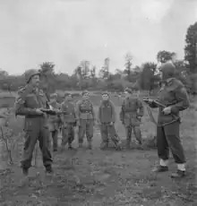 The 3rd Battalion of the 12th SS Panzer Division, commanded by Lieutenant-Colonel Karl Heinz Milius, committed some of the first atrocities against the Canadian prisoners of war.[29] The SS troopers were infuriated by the number of casualties they incurred when taking the village, and that these losses were inflicted by soldiers they viewed as inferior.[29] The first victim of the Normandy massacres was Private Lorne Brown, who refused to retreat and leave a severely wounded comrade behind.[29] The wounded man reported seeing Brown stand up in response to an order from a German soldier, only to be forced to the ground right after.[30] The German pinned Brown with his heel, and repeatedly bayoneted him while shouting curses.[29] The other wounded Canadian pretended to be dead, and was later captured by another SS soldier.[30]