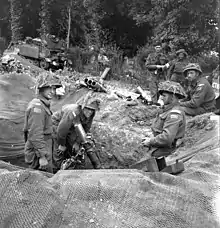 The 3-inch (7.62 cm) mortar firing personnel of Support Company, The Regina Rifle Regiment, near Bretteville-l'Orgueilleuse