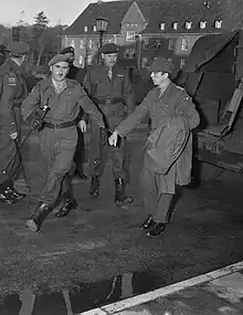 Meyer was the last German war criminal to be imprisoned outside of Germany by 1951, and the German government wanted him returned to Germany.[110] The Canadian government repatriated Meyer to a military prison in Werl on October 19, 1951, in order to improve its relations with Germany.[111] Canadian society was divided between supporters of clemency who felt that Meyer could play an important role in a new German or European military to counter the Soviet Union, or questioned the fairness of his trial, and opponents who did not want him let off the hook for the Ardenne Abbey murders.[112] The German government voiced its desire to grant him clemency, and the Canadian Cabinet gave its approval in January 1954.[111] Meyer officially gained his freedom on September 7, 1954, nine years after he was imprisoned.[111] He was met in his home town of Niederkruchten by a crowd of 5,000 SS veterans and supporters who lined the town's main street — many holding burning torches.[113] He joined the Waffen SS Veterans Association, found a job selling beer to Canadian soldiers stationed in Germany, and remained unrepentant for the crimes that he and his men committed.[114]