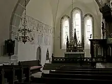 Inside, the church is quite profusely decorated with medieval murals. These seem all to have been made by the so-called Master of the Passion of Christ. They depict scenes from the Passion of Christ, several saints and some scenes depicting devils and women. Among the furnishings of the church, only the base of the baptismal font and the church bell are medieval (12th and 13th centuries). The church bell is supposedly the largest 13th century church bell in Sweden. Other furnishings date mostly from the 18th century and the late 19th century.[1]