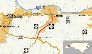North Carolina Highway 110 (NC 110) is a 5.51-mile-long (8.87 km) primary state highway in the U.S. state of North Carolina. The route serves to connect the rural communities of Cruso, Woodrow, and Bethel with the town of Canton entirely in Haywood County