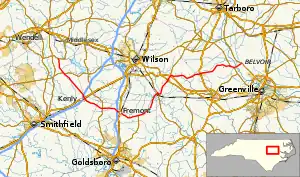 NC 222 was established in 1934 traversing between US 301/NC 22 in Kenly, to NC 58 near Lindell. In 1938, NC 222 was rerouted at Eureka to NC 58 in Stantonsburg; its old alignment was downgraded to secondary roads.[2] In 1948, NC 222 was extended west on new primary routing to NC 42; the following year it extended again to its current western terminus at NC 231. Between 1963-1968, NC 222 was rerouted through Stantonsburg. In 1978, NC 222 was extended east to NC 33 in Belvoir.[3]