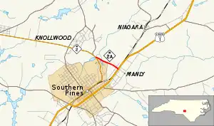 In 1951, NC 2A started at an at-grade intersection with US 1 (North May Street) in the southern portion of the community of Manly. From there, the highway ran northwesterly across the Seaboard Air Line Railroad to an intersection with a primitive trail (now Clark Street) in Southern Pines. The roadway continued northwestward to a bridge over a small, unnamed creek (now nonexistent). Turning slightly westward, the road proceeded to its northern terminus, an intersection with NC 2 (now an interchange with US 1).[1][2]