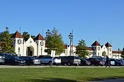 The North Carolina State Commercial & Education Buildings are the fairgrounds' oldest permanent buildings.[5] Built in 1928, this pair of rectangular exhibition halls are Spanish Mission Revival style or Mediterranean Revival style buildings.[5][15] Atwood and Weeks, an architectural firm from Durham, designed the stucco-covered buildings.[5] The twin buildings appear as a single structure because of their unified façade with tower-flanked entrances and glazed terra cotta ornamentation.[15] Together, this building complex is 504 feet (154 m) in length and 80 feet (24 m) in depth.[15] It was listed on the National Register of Historic Places in 1987 and is a Raleigh Historic Landmark.[15][5]