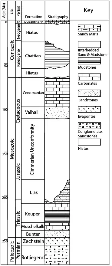 - In the Late Upper Triassic to the Lower Jurassic, the Lias Unit is composed of sandstone, shale, limestone, and clay. This unit was deposited between 200- 180 Ma, though is particularly difficult to define a thickness due to a large hiatus, which occurs above this unit. This pause in deposition, the late Cimmerian Unconformity lasted until the Middle Cretaceous approximately 110 Ma.[18][19]