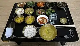 Historically, Korean cuisine has evolved through centuries of social and political change. Originating from ancient agricultural and nomadic traditions in southern Manchuria and the Korean Peninsula, it has gone through a complex interaction of the natural environment and different cultural trends.[1] Rice dishes and kimchi are staple Korean foods. In a traditional meal, they accompany both side dishes (panch'an) and main courses like chuk (porridge), pulgogi (grilled meat) or myŏn (noodles). Soju liquor is the best-known traditional Korean spirit.[2]